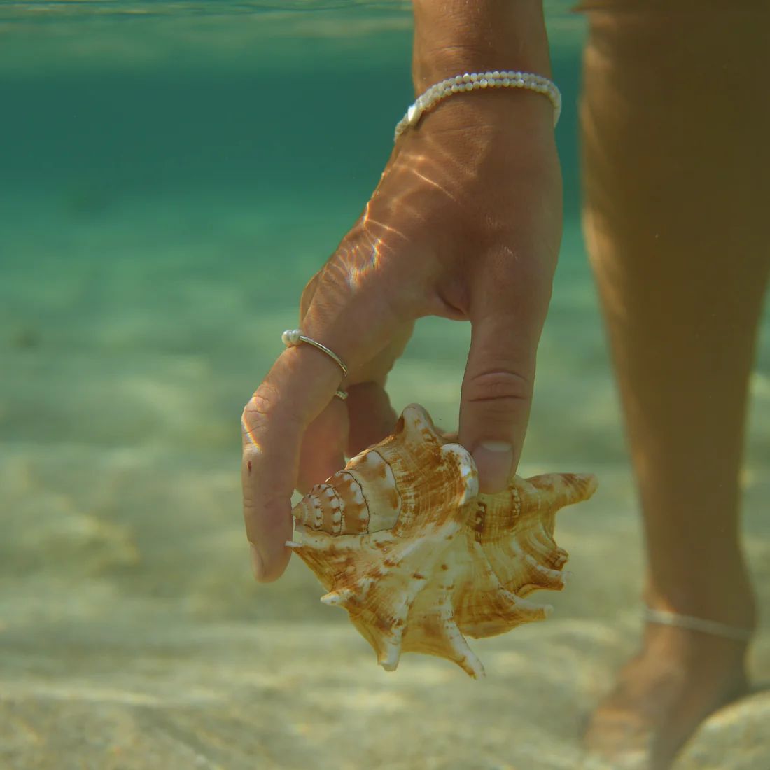 With its unique design, the space between the pearls allows for a comfortable, adjustable fit—just like the way a crab finds its way in the shifting sands.