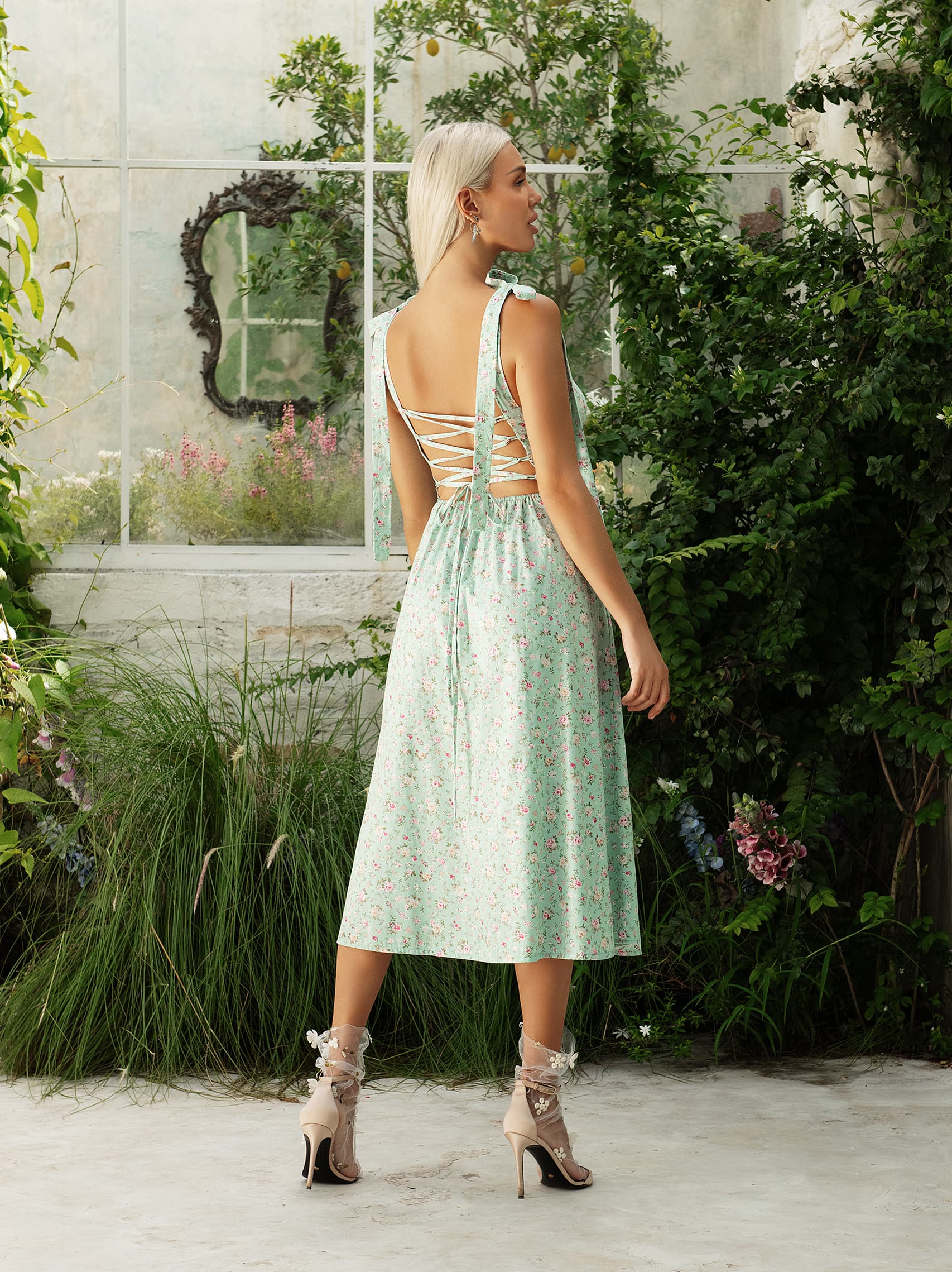 Embrace the charm of summer with these beautifully crafted cotton dresses, featuring delicate floral prints. Designed for both comfort and sophistication, each dress offers a structured bodice with built-in cups for a flattering fit, adjustable tie straps, and a captivating corset-style lace-up back that enhances the silhouette. The flowing A-line skirt, complete with a thigh-high slit, allows for graceful movement and effortless elegance. Made from high-quality materials with attention to detail, these dresses blend vintage romance with modern femininity, making them a perfect choice for warm-weather days and special occasions.