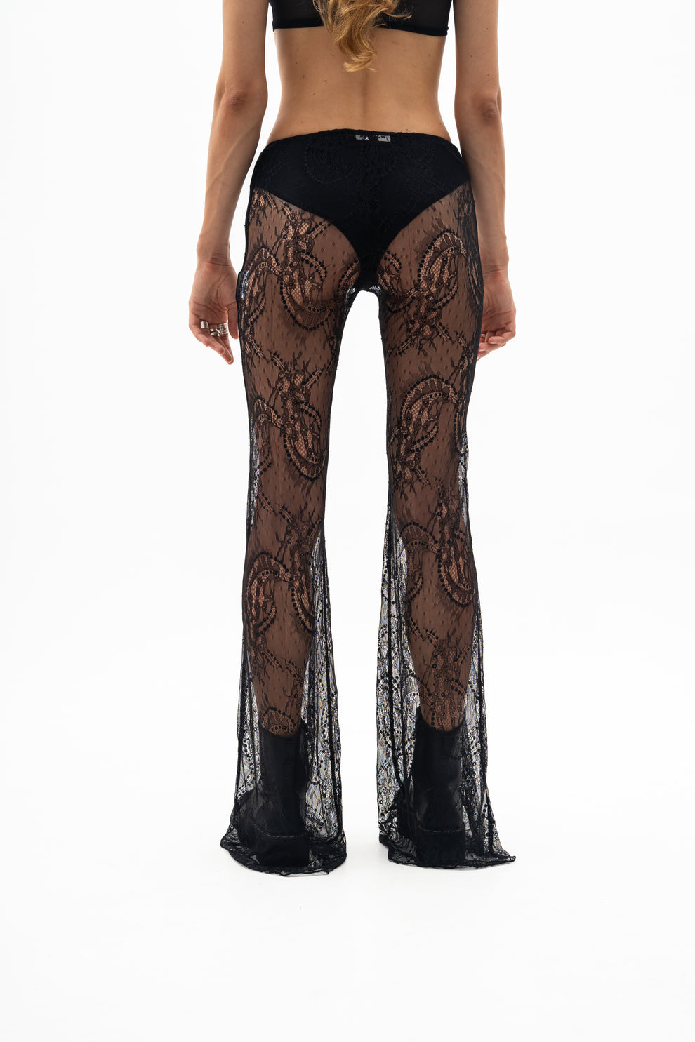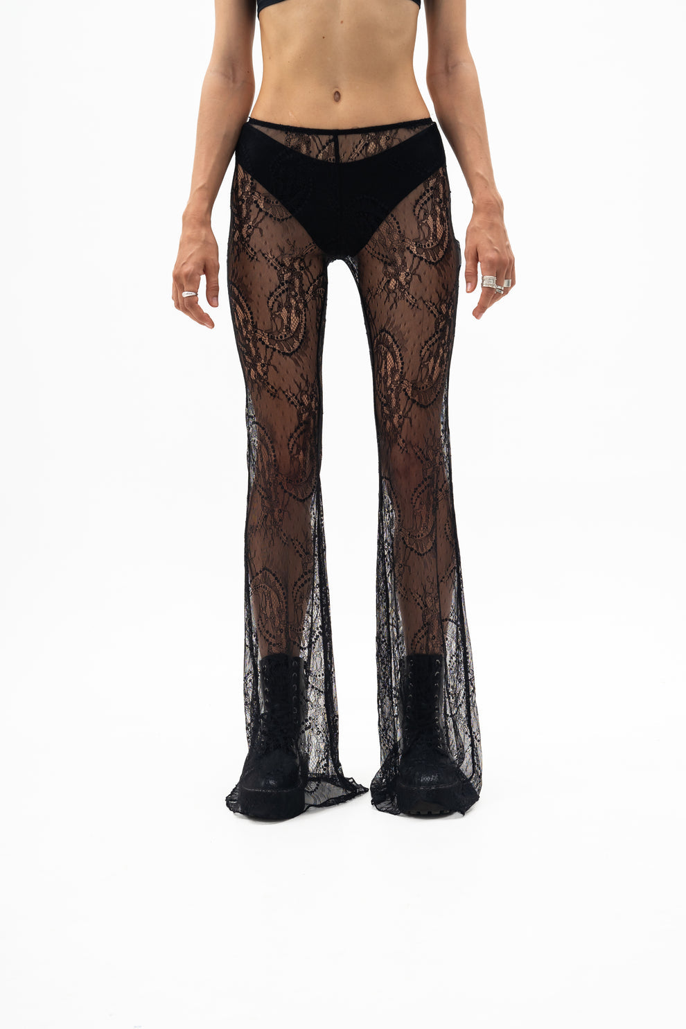 Bold and provocative — these pants are crafted from semi-sheer lace with a striking pattern. The flare from the knee creates a dynamic, elongated silhouette that moves beautifully and adds a touch of drama. Lightweight and airy, yet full of attitude — perfect for evening looks, photoshoots, or special occasions.