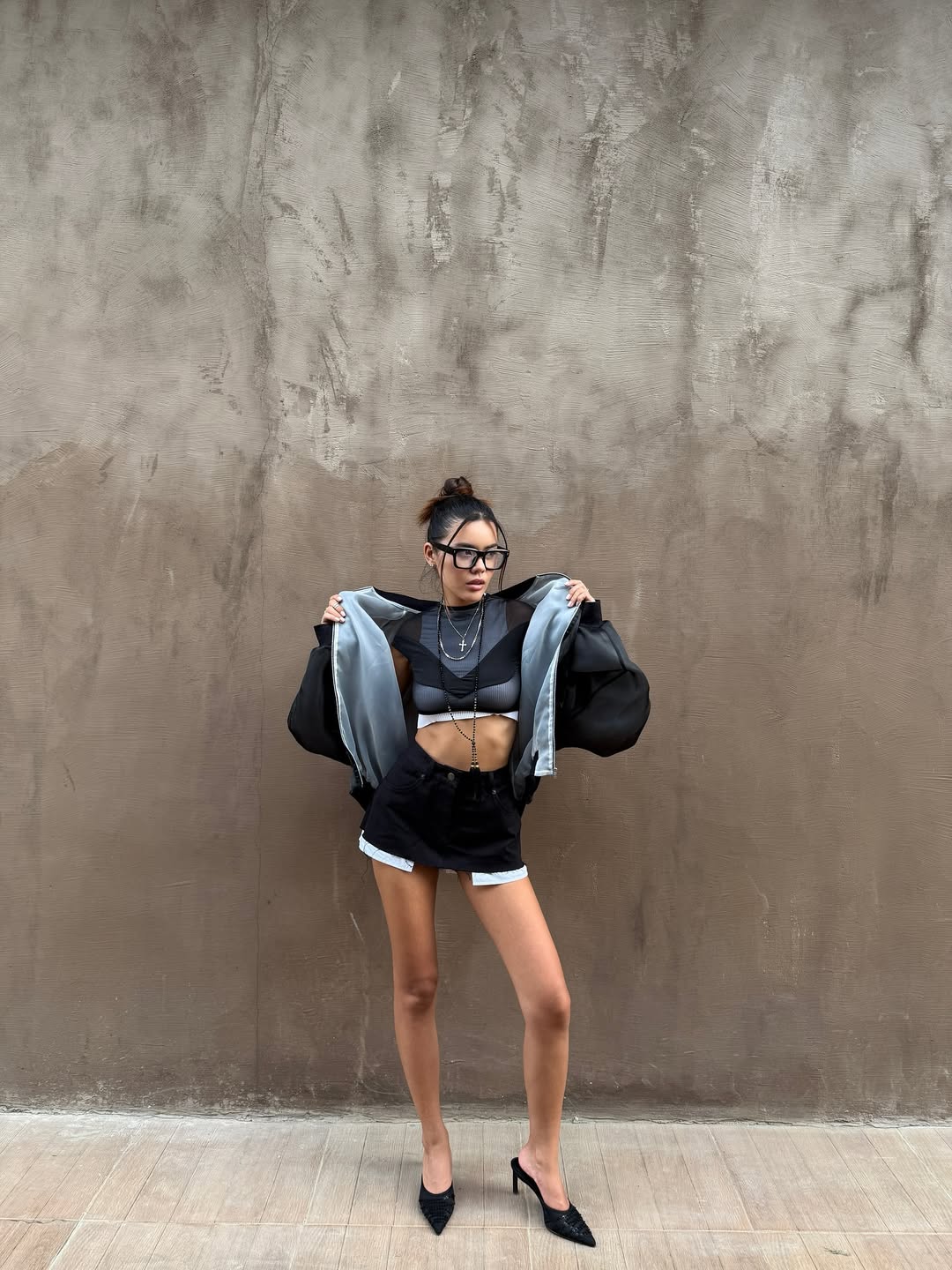 Perfectly pairs with high-waisted trousers, skirts, or layered under a blazer for an evening look. The elastic fit ensures comfort and support, while the mix of materials adds an architectural edge.