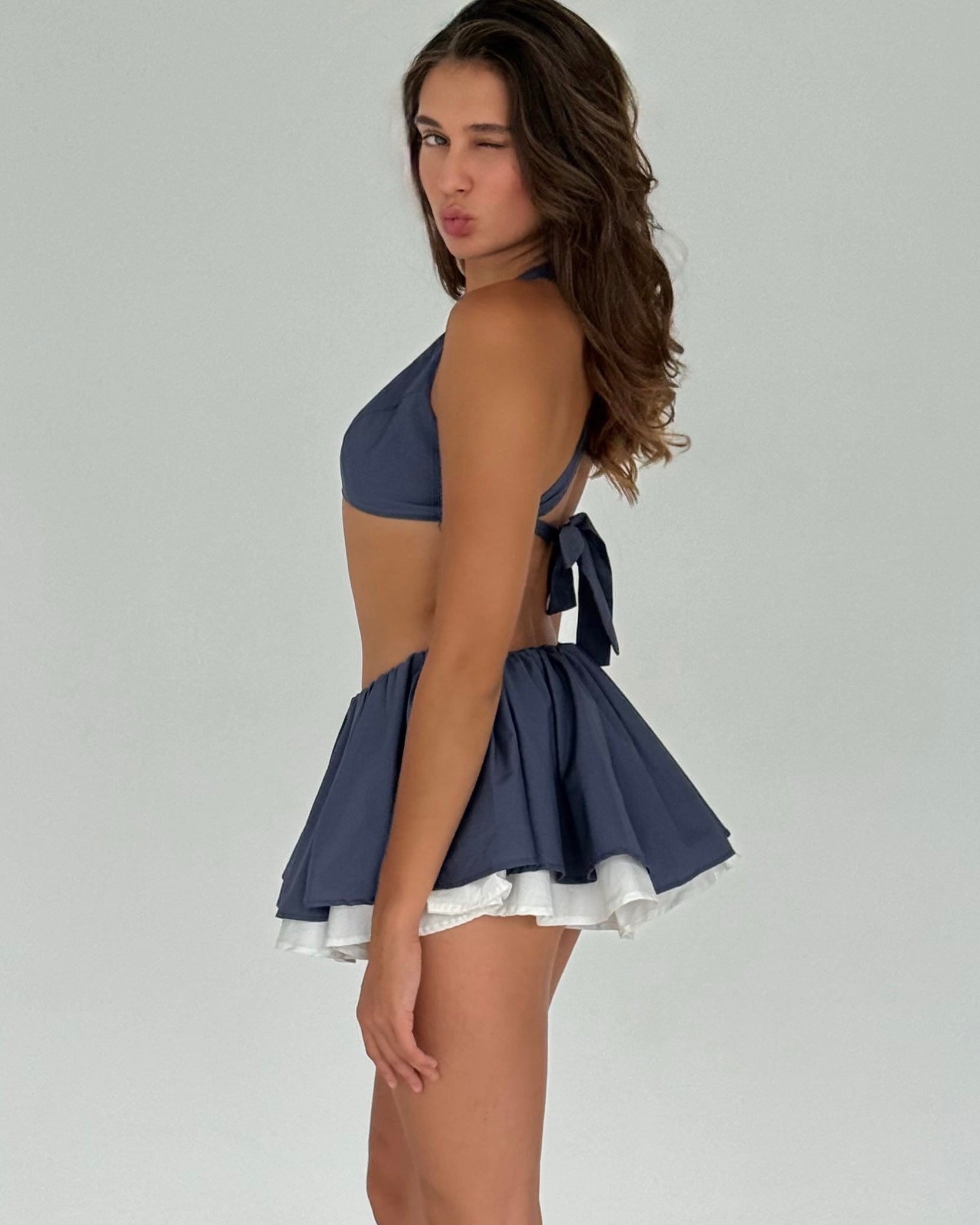 A two-piece set featuring a tie-back crop top with a criss-cross open back, paired with a skirt with built-in shorts for comfort and confidence.